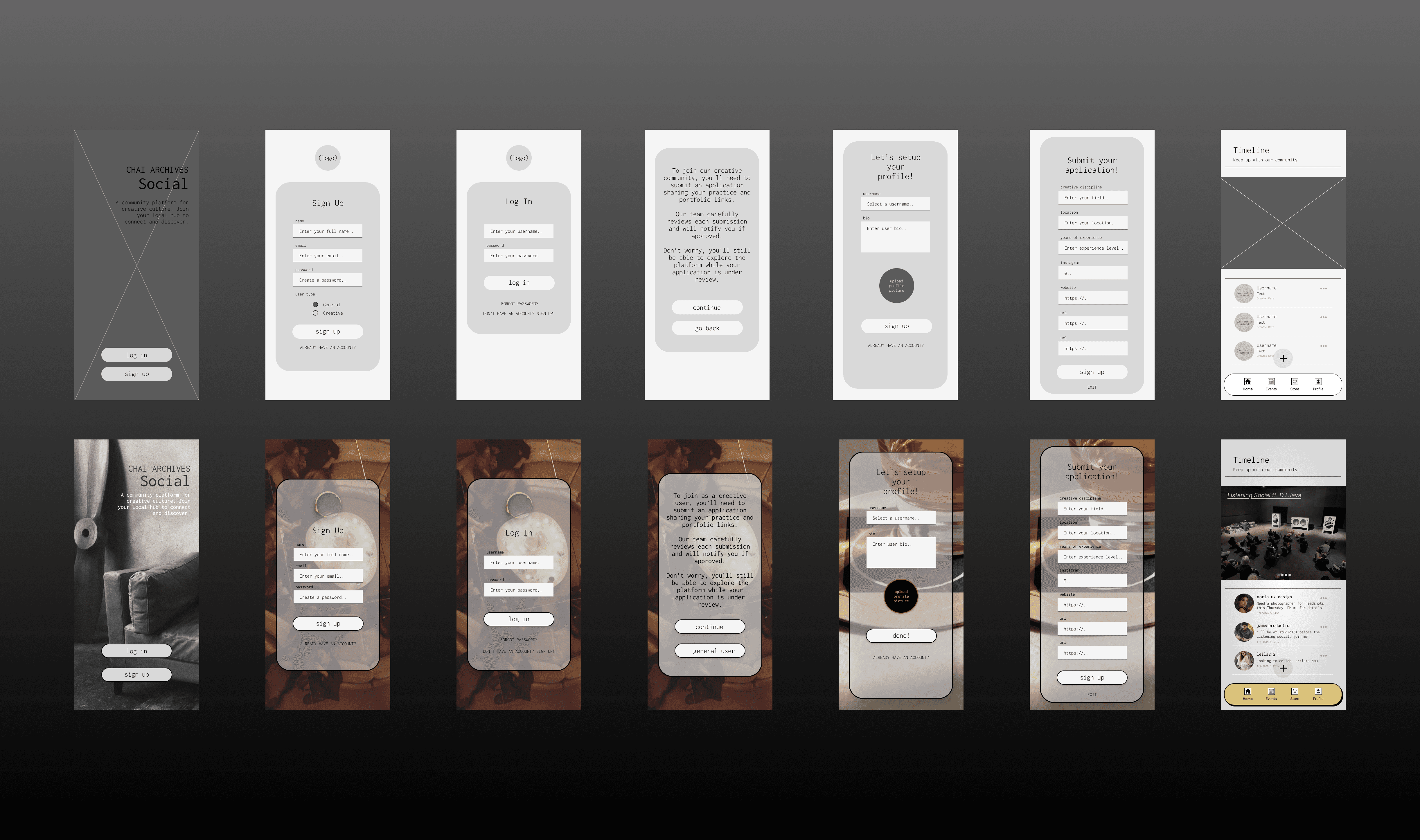 The app serves as a digital extension of Chai Archives — a space where users can explore creative work, discover local artists, studios, and events, and build meaningful connections around shared interests. The onboarding experience introduces the platform’s ethos through minimal typography, muted imagery, and a tactile interface, setting a calm and curated tone from the first interaction.